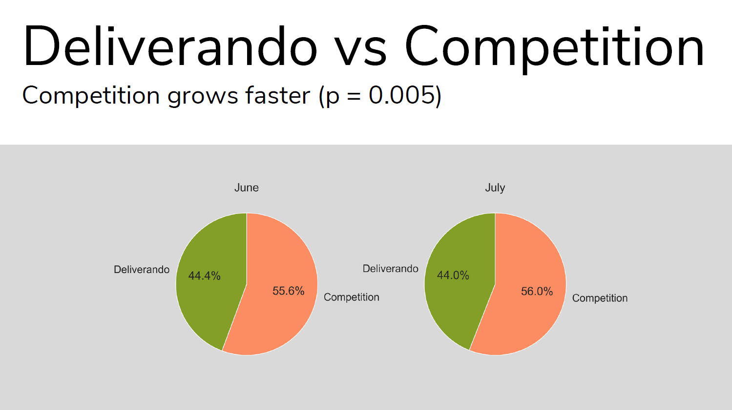 For a lightning talk in front of stakeholders, I decided to produce beautiful and simple plots in Python's Seaborn library, one monthly comparison for each relevant KPI as bar charts and some pie charts to see how the market share of our company and competitors changed between months. Any topic, including food delivery, is an exciting challenge when it comes to presenting analysis results to a non-technical audience. I hope that you will find my way easy to grasp and entertaining, the only thing you must do is check the final presentation. Alternatively, go through some of the results in the following paragraphs.