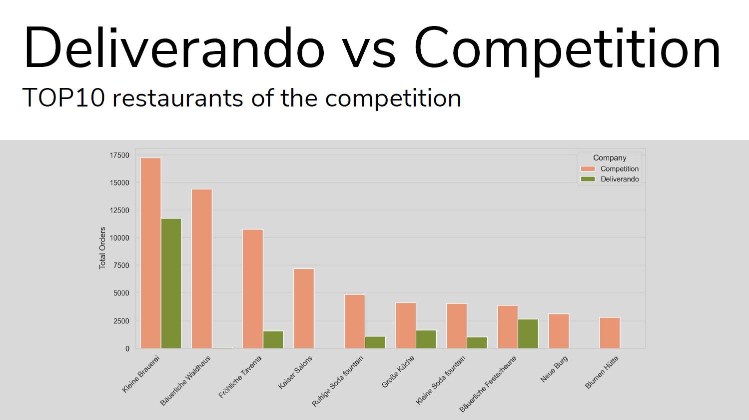Fig 1. TOP10 restaurants by sales for competition and their sales at Deliverando. In this sample, Deliverando is lacking behind, but this means nothing else but room for improvement!